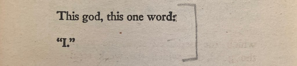 Rand begins to use the Unspeakable Word, and with it starts to push her ideals more harshly onto readers. “I” now begins to see the world around him differently, he starts to question the warrant for life. He writes, “I wished to know the meaning of things. I am the meaning” (108). This sentence marks the shift to Rand’s belief in the individual.